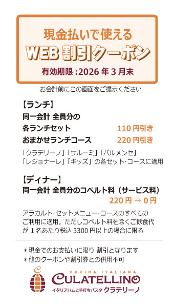 現金払い限定の割引クーポンです。キャッスレス決済にはご利用いただけません。
