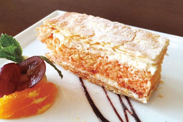 夏にピッタリのデザートメニューのご紹介です。メレンゲと生クリームのアイスケーキ《セミフレッド》は、さっぱりとした酸味のミックスベリー風味で。また、人気のリキュール「アぺロール」を浸したスポンジ生地とパイ生地を重ねた《トルタディプロマティカ》、リコッタチーズとオレンジピールを使ったイタリア版チーズケーキもこの時期のおススメです。地元産イチゴや完熟パイナップルを使った自家製ジェラートもご用意しています。