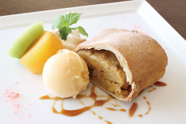 北部アルト・アディジェ州の伝統菓子《ストゥルーデル》は、安納芋とリンゴとナッツをたっぷり詰めた当店オリジナルレシピ。季節替わりの《セミフレッド》は、エミリア=ロマーニャ州のクルミのリキュール「ノチーノ」を使った、ザバイオーネ風濃厚クリームのアイスケーキです。さらに、知り合いからいただいた国産キウイが完熟したので、イタリア風タルト《クロスタータ》とシャーベットにしてご提供します。