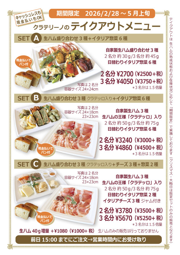 今年の生ハムの仕込みがようやくひと段落したので、テイクアウトオードブルを2/28より5月上旬までの期間限定で再開します。