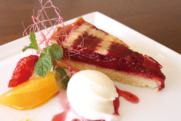 デザートには、旬のイチゴを使ったイタリア風タルト《イチゴのクロスタータ》、レモン&ジンジャー風味の《セミフレッド》、そして細かく刻んだ国産クルミを焼き込んだクラシックな焼き菓子《クルミのトルタ》を加えました。