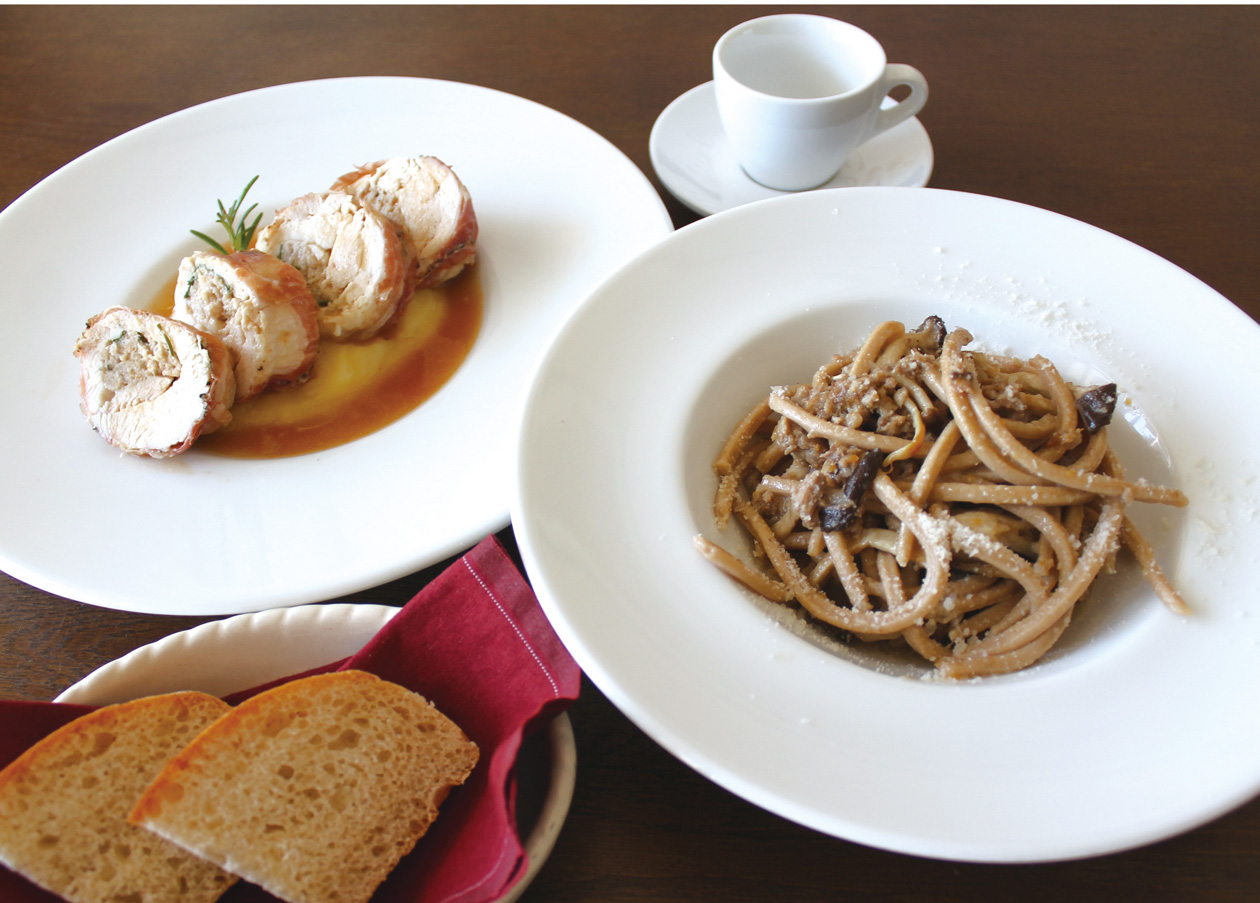 プリモ(パスタ)には、全粒粉入りの手打ちパスタ《ストランゴッツィ》に鴨肉とキノコの煮込みソースを合わせます。また、セコンド(メイン)は、大山鶏に詰め物をしロール状にして焼いた《ポルケッタ風ロースト》をご用意。こちらもウンブリア州で広く作られる郷土料理です。
